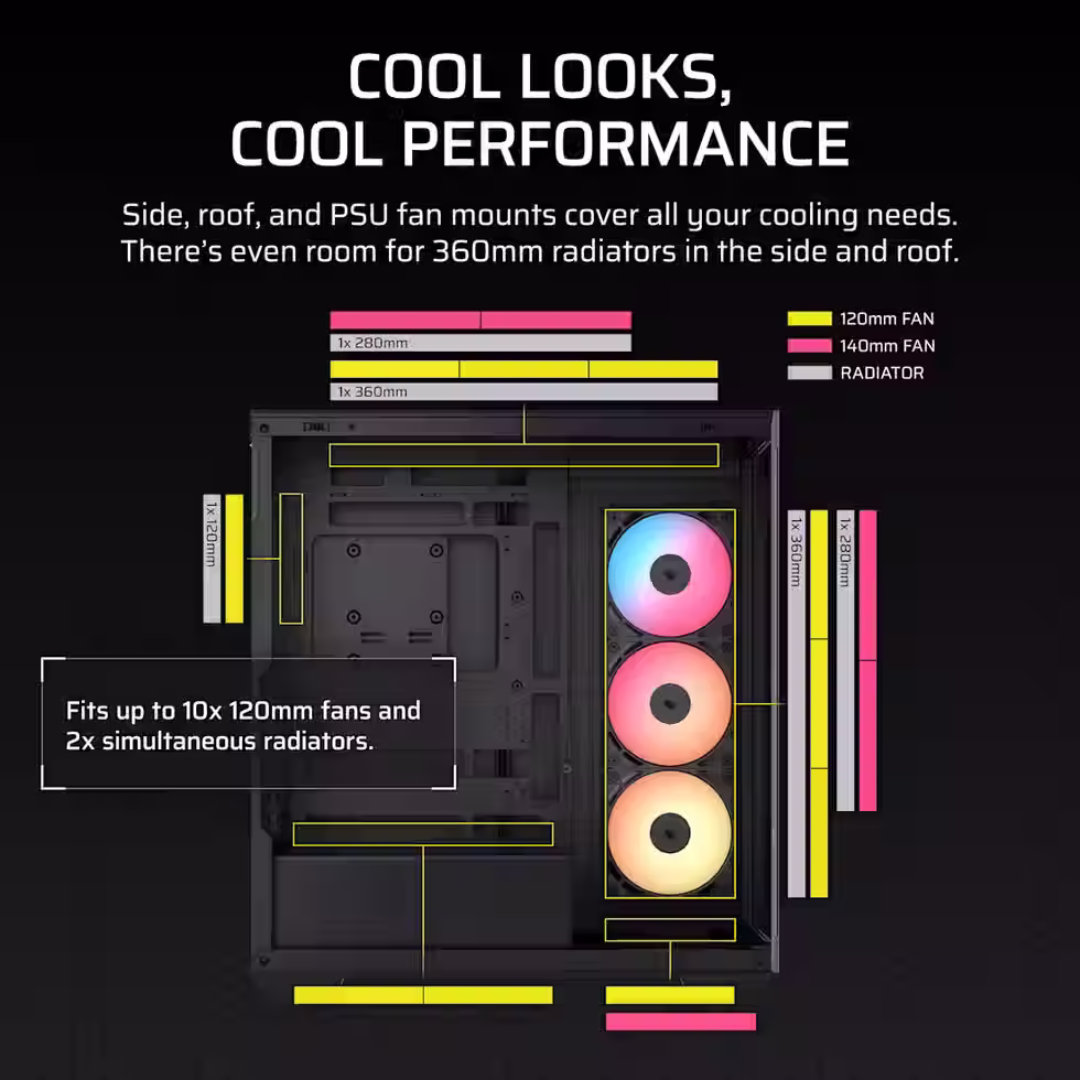 - Side, roof, and PSU fan mounting points for great cooling